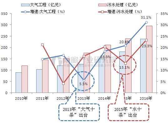 根據(jù)前瞻產(chǎn)業(yè)研究院發(fā)布的《2017-2022年中國環(huán)保行業(yè)發(fā)展前景與投資預測分析報告》數(shù)據(jù)顯示,2013年“大氣十條”出臺后,2014年、2015年大氣污染治理增長率分別為18.3%、20.8%,而2013年這一數(shù)值僅為5.5%;2015年“水十條”出臺后,2016年污水處理增長率為23.3%。